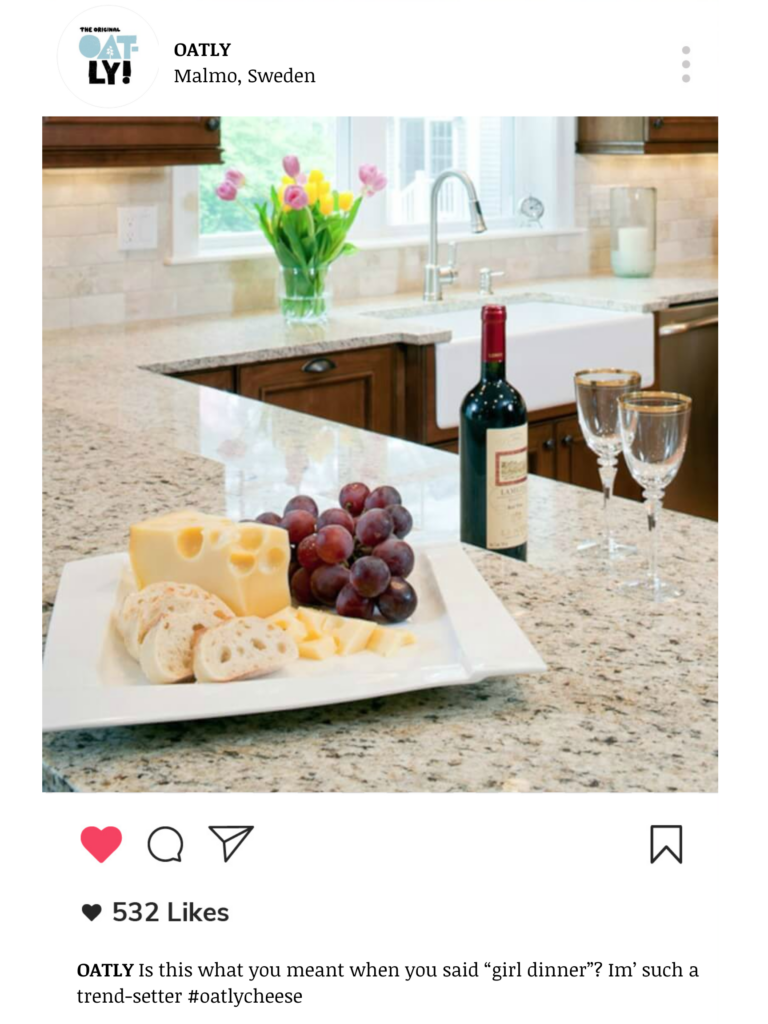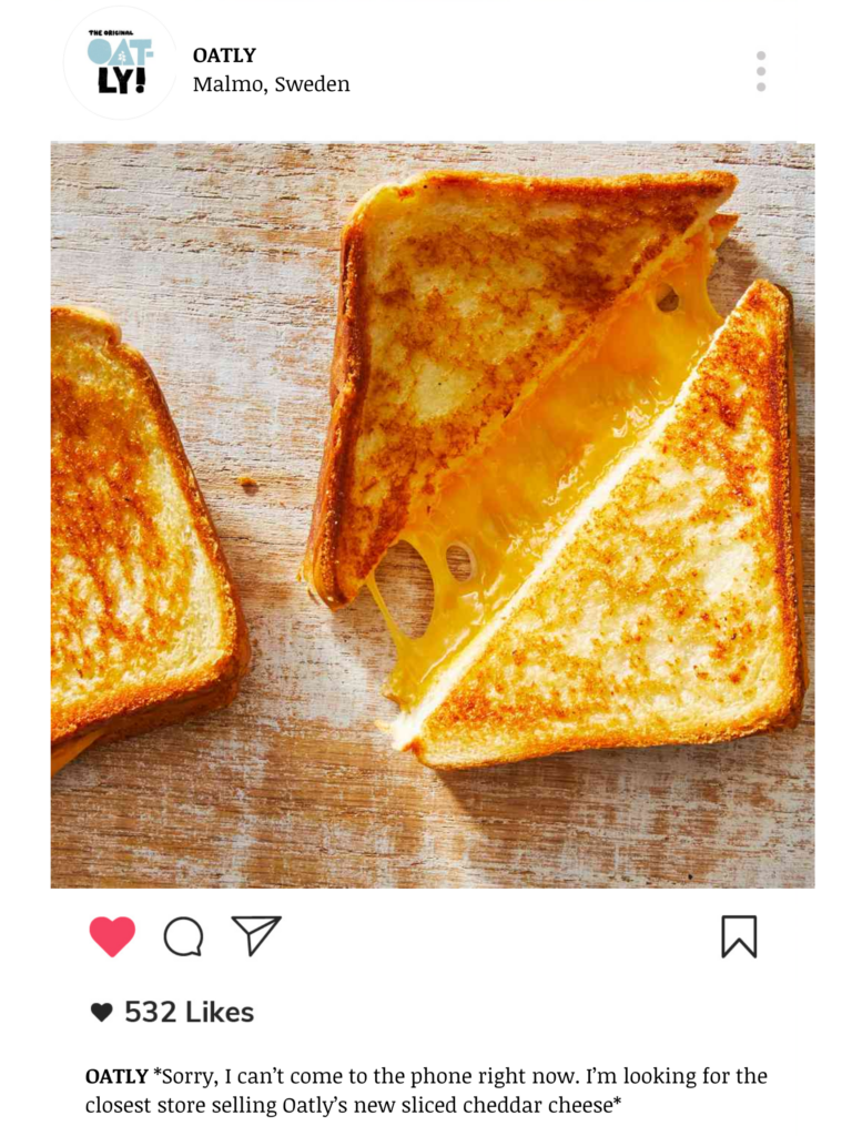 That’s why Oatly created a dairy-free oat milk-based cheddar cheese. We are inviting consumers into the lifestyle of being "oatmilk–based–plant-based–not-destroying-the-world-or-overworking-livestock-environmentally-friendly" lifestyle. We recognize that cheese is ingrained in food traditions all over the world. There isn’t a culture that doesn’t indulge in cheese in some form. Cheese is the star of some dishes, or an ingredient incorporated into a more complex vision. Either way, people are eating cheese.